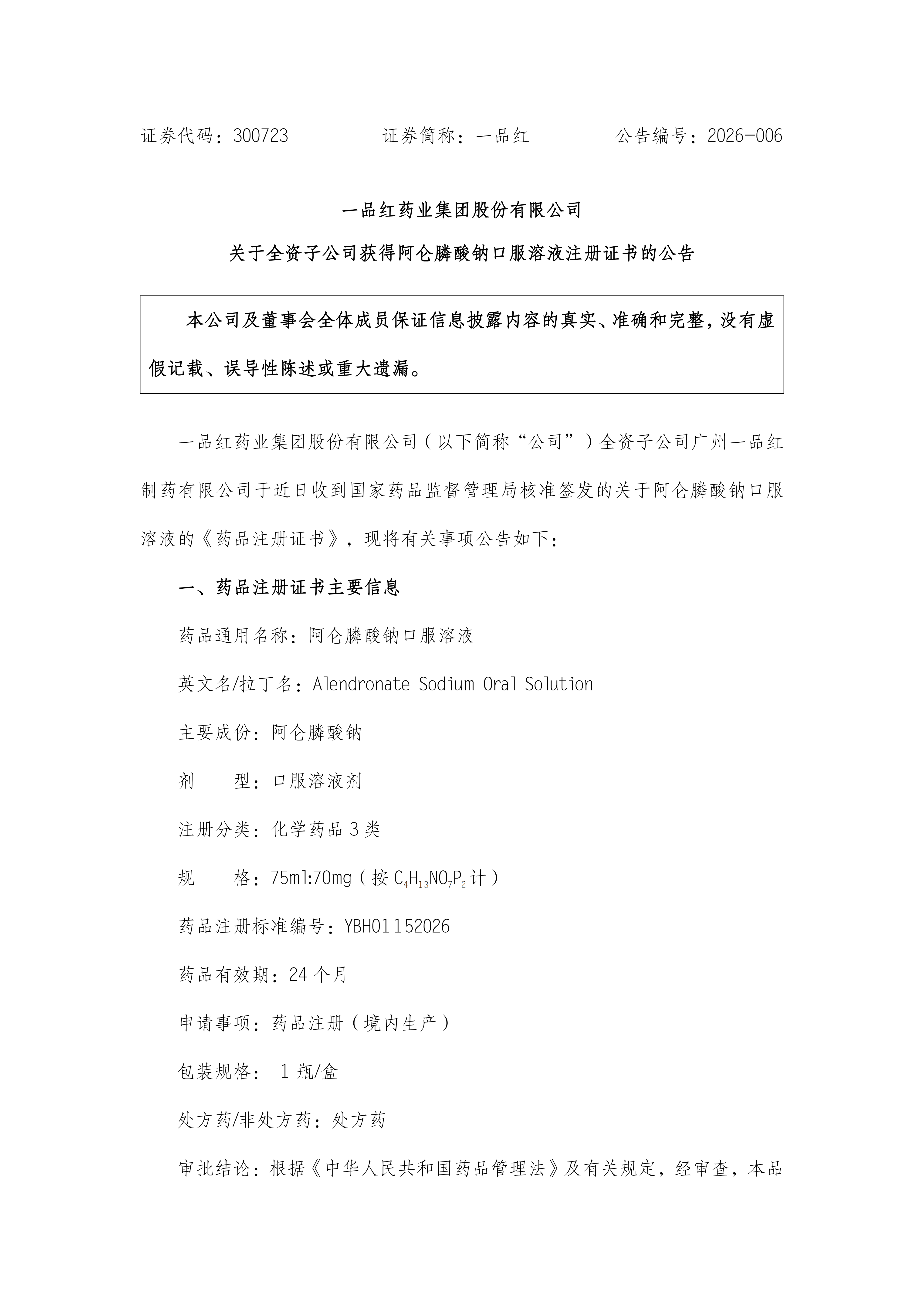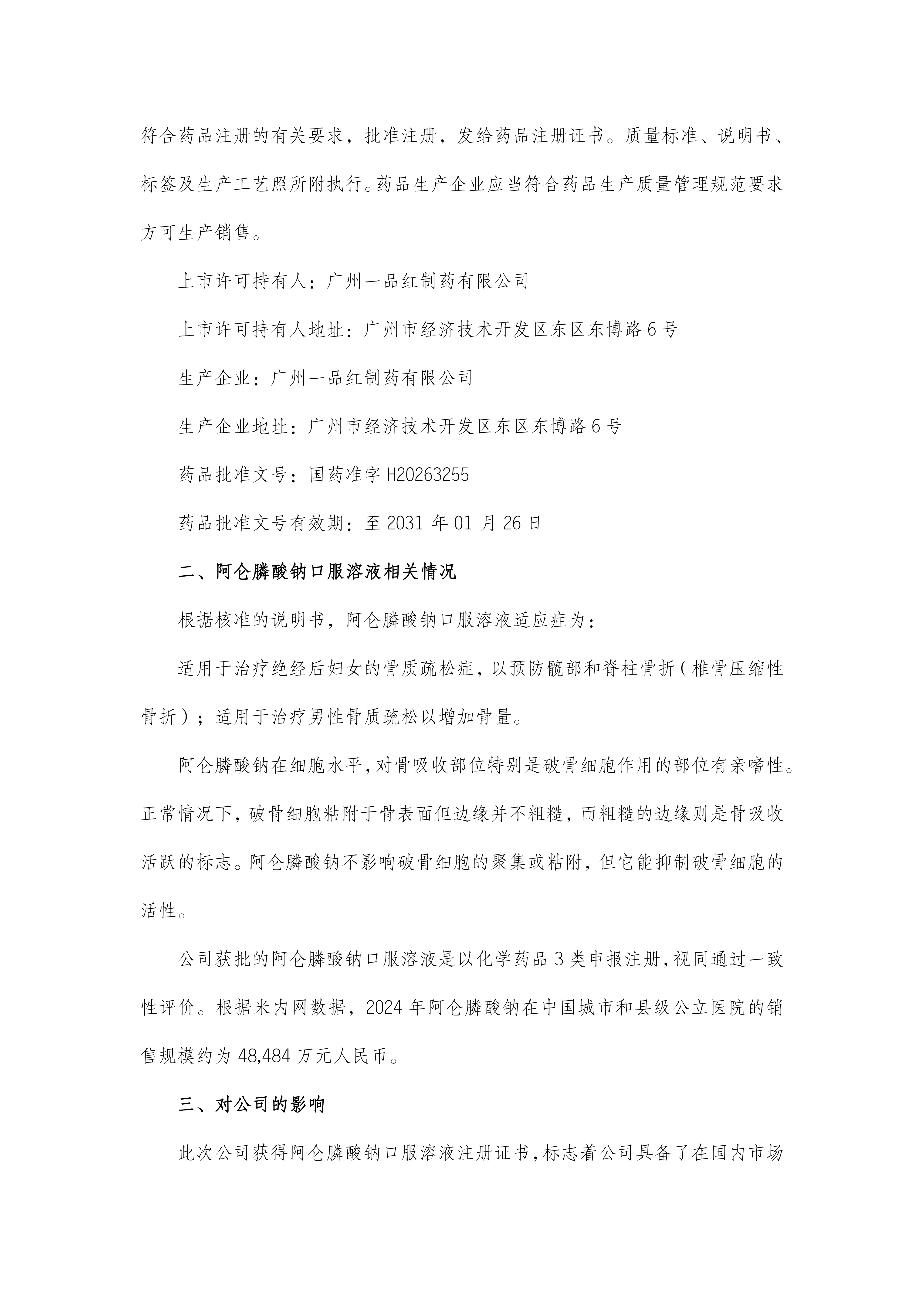 根据《350vip浦京集团有限公司药业集团股份有限公司关于全资子公司获得阿仑膦酸钠口服溶液注册证书的公告》(公告编号:2026-006),现予以公告。